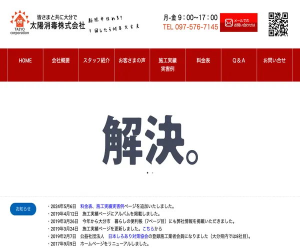 シロアリだけでなくネズミ・スズメバチ・ゴキブリなど害虫害獣全般に対応しており、日曜も応相談で柔軟に対応してくれます。