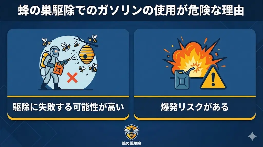 - ガソリン駆除は爆発・火災リスクが非常に高い
