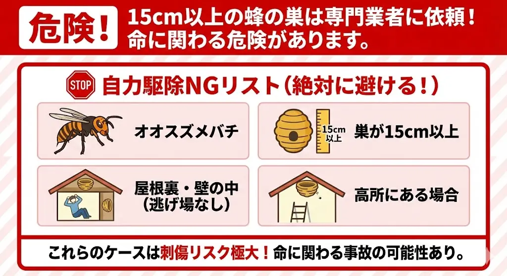 特に、次の条件にひとつでも当てはまる場合は、自力での駆除は絶対に避けましょう。