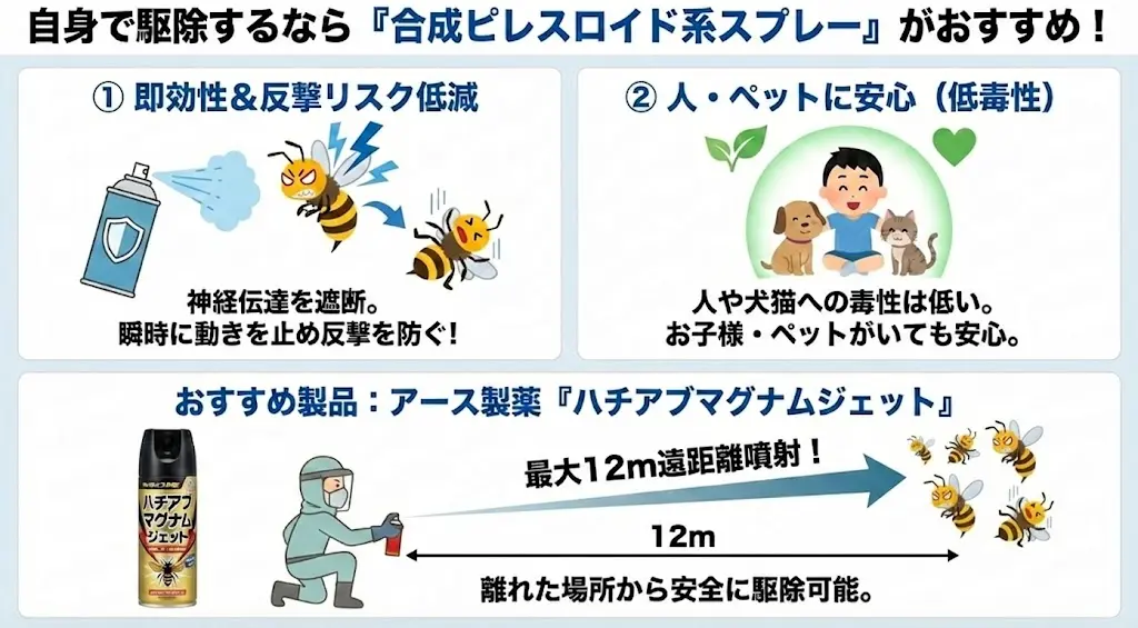 ピレスロイド系は昆虫の神経伝達を瞬時に遮断するため、噴射直後にハチの動きを止め、反撃リスクを大幅に下げられます。