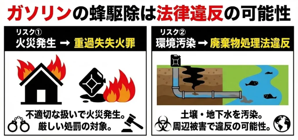 ガソリンを撒いて蜂を駆除する行為は、法律違反に問われる可能性があります。