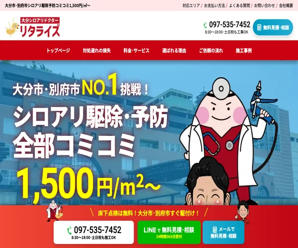 リタライズは、代表が最初から最後まで直接対応する丁寧なサービスが特徴のシロアリ駆除業者です。