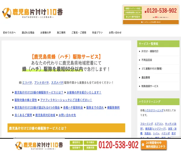 鹿児島県で蜂の巣駆除に対応している鹿児島片付け110番は、リベラルマーケティング株式会社が展開する生活トラブル解決サービスです。