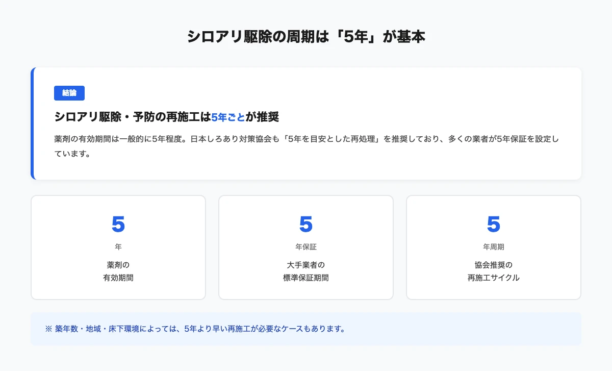 この5年という周期は、日本しろあり対策協会の基準と薬剤の有効期間に基づいた根拠のある数字です。