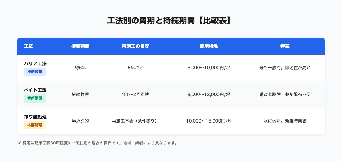 【比較表】工法別に見るシロアリ駆除の周期と持続期間