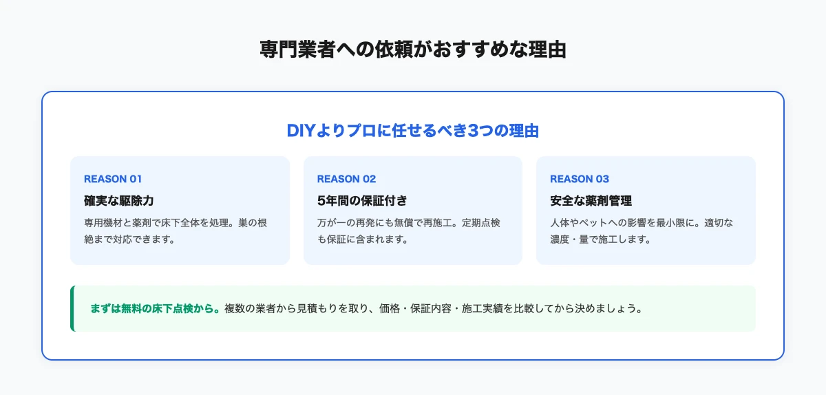 専門業者に依頼すれば、床下の徹底的な調査から適切な工法の選定、施工後の保証まで一貫して対応してもらえます。