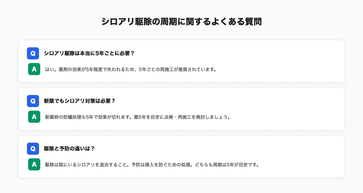最後に、シロアリ駆除の周期に関するよくある質問にお答えします。