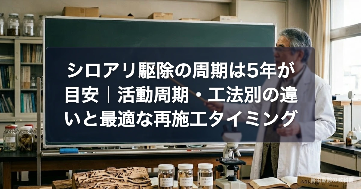 この記事では、シロアリ駆除の周期の根拠から工法別の違い、再施工が必要なサインまで詳しく解説します。