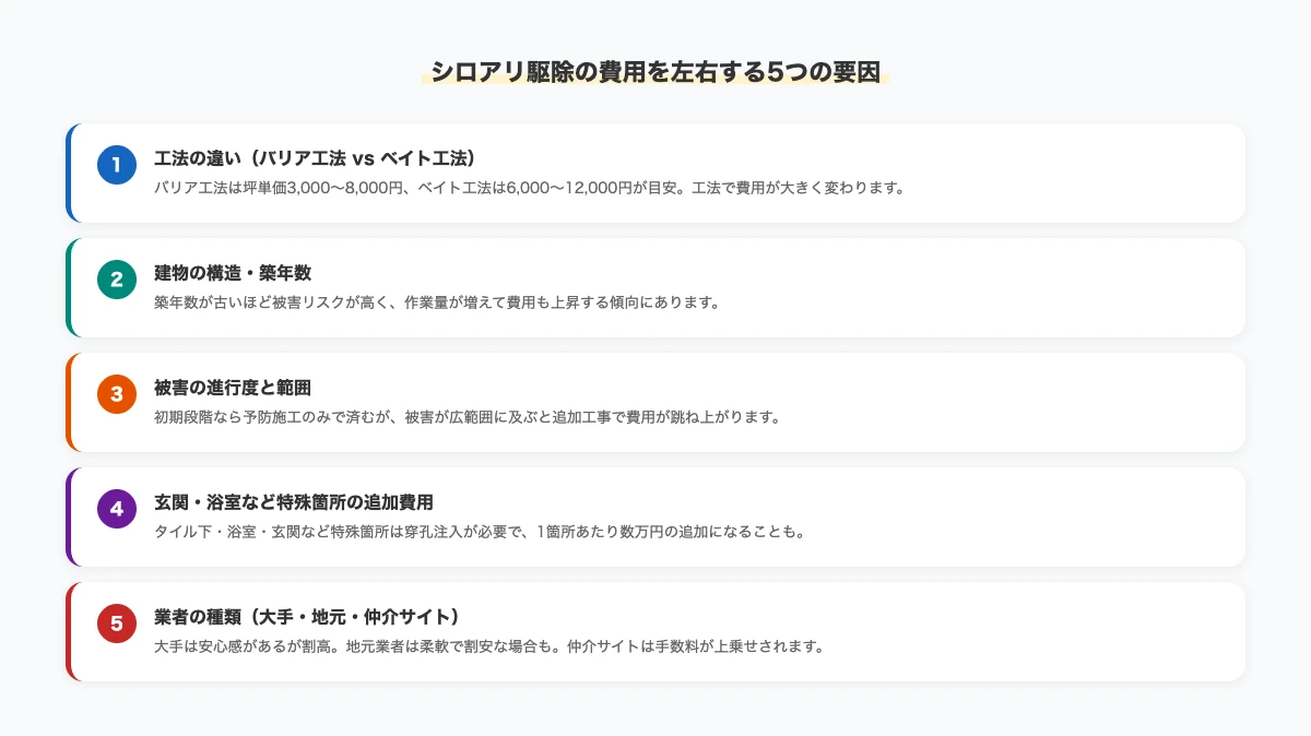 シロアリ駆除の費用は、いくつかの要因によって大きく変動します。