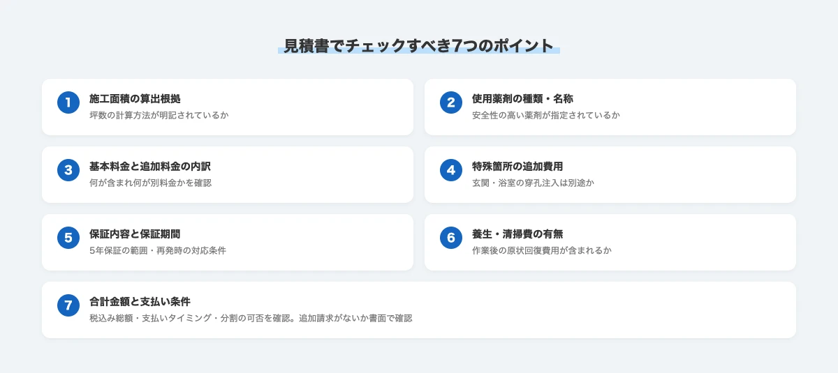 「基本料金に含まれる範囲はどこまでですか?」と質問し、薬剤費・施工費・出張費・養生費が個別に確認できる見積書を出してもらいましょう。