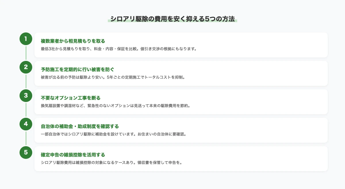 シロアリ駆除は決して安い出費ではないため、できるだけ費用を抑えたいと考える方も多いでしょう。