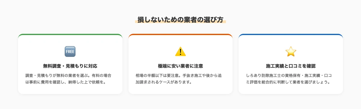 極端に安い見積もりの裏には、施工範囲の限定・必要な薬剤の省略・追加工事の後出しといった問題が隠れている可能性があるでしょう。