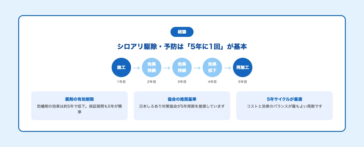 結論からお伝えすると、シロアリ予防の薬剤効果は約5年で切れるため、5年に1回の定期的な再施工が基本です。