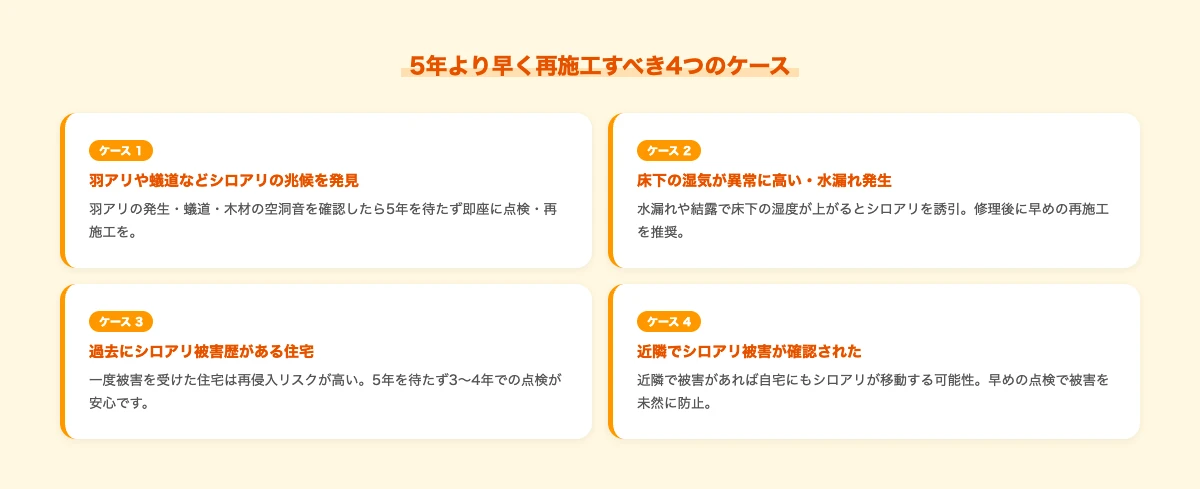 ただし、羽アリの発見・床下の水漏れ・過去の被害歴・近隣の被害報告がある場合は、5年を待たず早めの点検・再施工を検討しましょう。