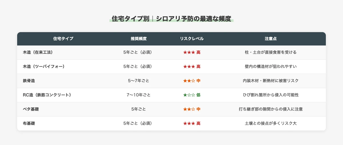 シロアリ予防の最適な頻度は、住宅の構造や基礎のタイプによっても変わります。