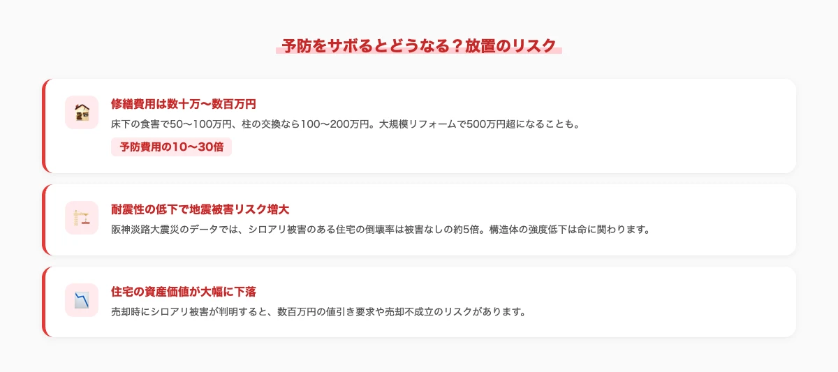 シロアリ予防を怠ると、修繕費用・耐震リスク・資産価値の低下という3重のダメージを受ける可能性があります。5年に1回の予防は「保険」と考えましょう。