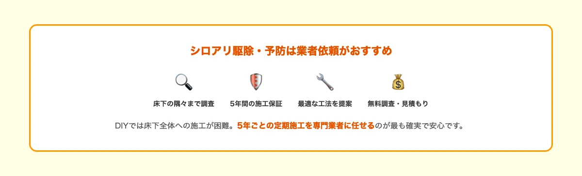 シロアリ駆除・予防を確実に行うなら、専門業者への依頼がもっとも安心な選択です。
