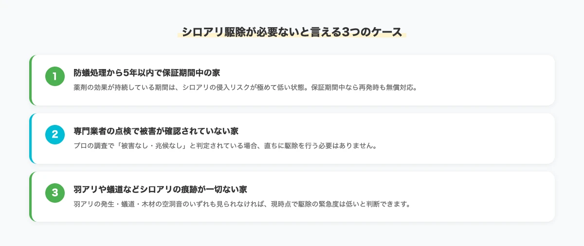 シロアリ駆除が必要ないと判断できるのは、防蟻処理から5年以内で保証期間中、専門業者の点検で被害なし、シロアリの痕跡が一切ないという3つの条件を満たす場合に限られます。
