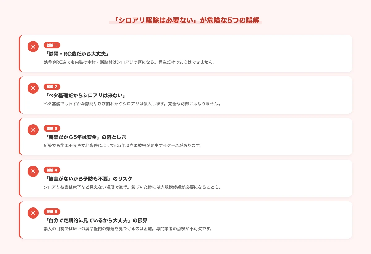 「うちはシロアリ駆除なんて必要ない」と思い込んでいるケースの多くは、実は根拠のない誤解に基づいています。
