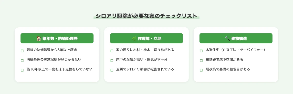 シロアリ駆除が必要かどうかを判断するには、築年数・立地・構造の3つの観点から総合的に確認することが大切です。