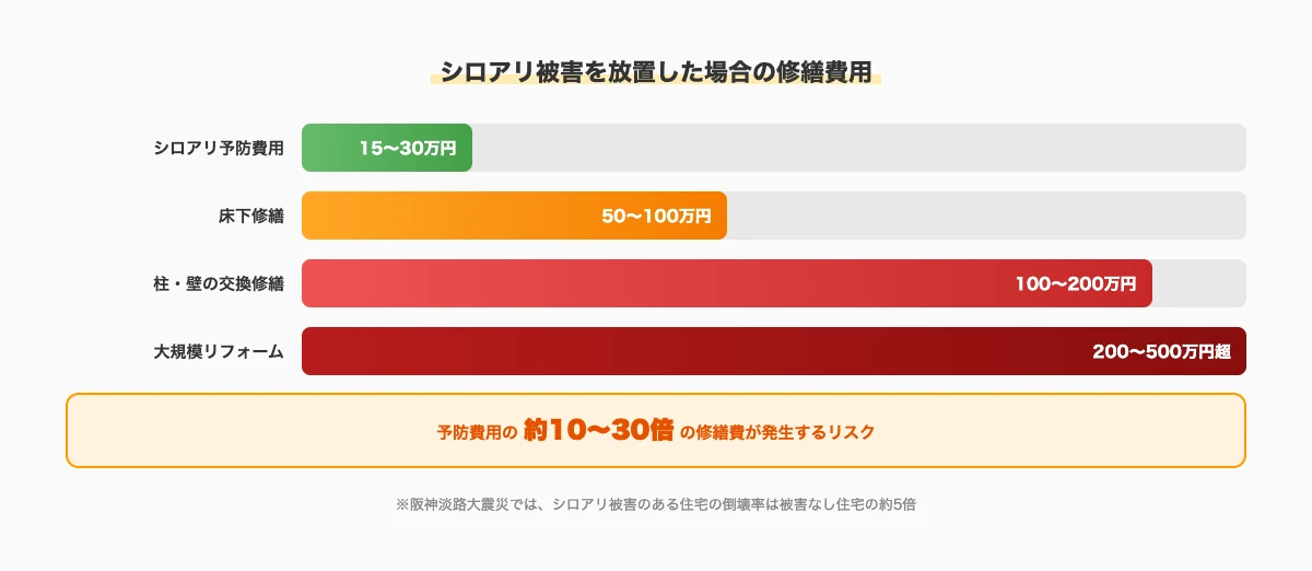 シロアリの予防処理費用が15万〜30万円程度であることを考えると、放置による修繕費用は桁違いです。