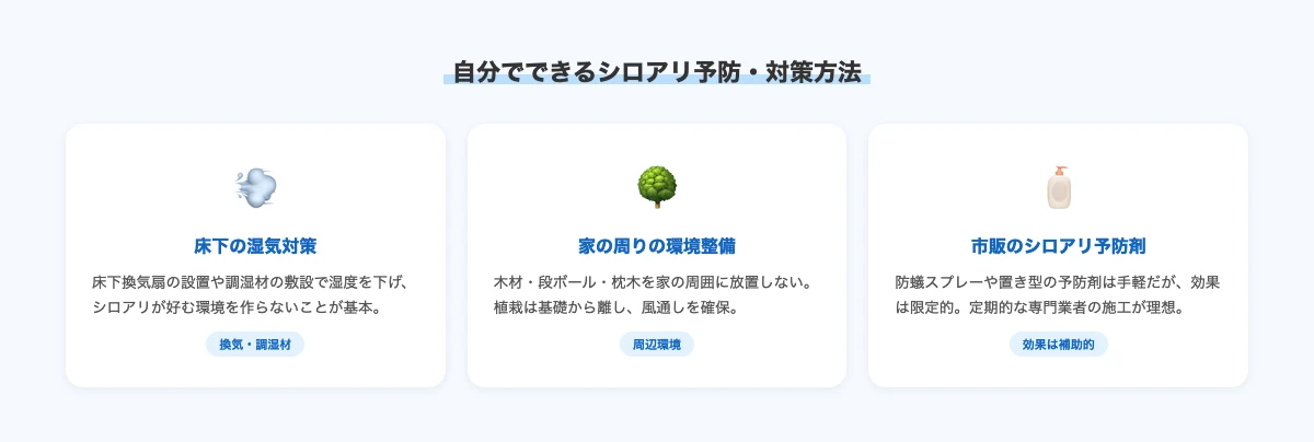 専門業者への依頼とあわせて、自分でもできるシロアリ予防策を実践することで被害リスクをさらに減らせます。