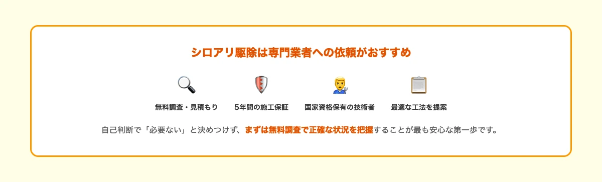 シロアリの駆除・予防は、専門業者に依頼するのが最も確実で安心な方法です。