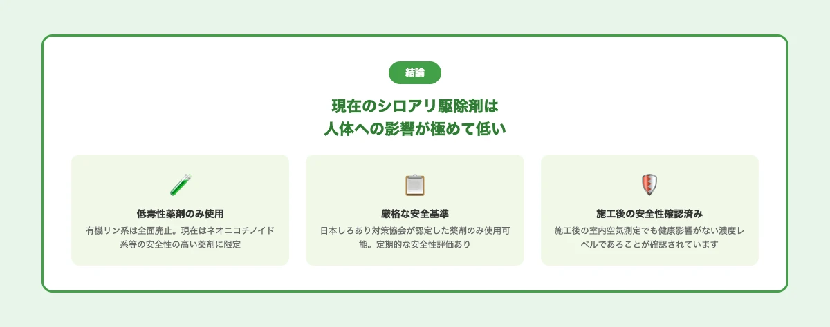 かつて問題となった有機塩素系薬剤はすでに使用禁止されており、現在の駆除剤は安全性が大幅に向上しています。