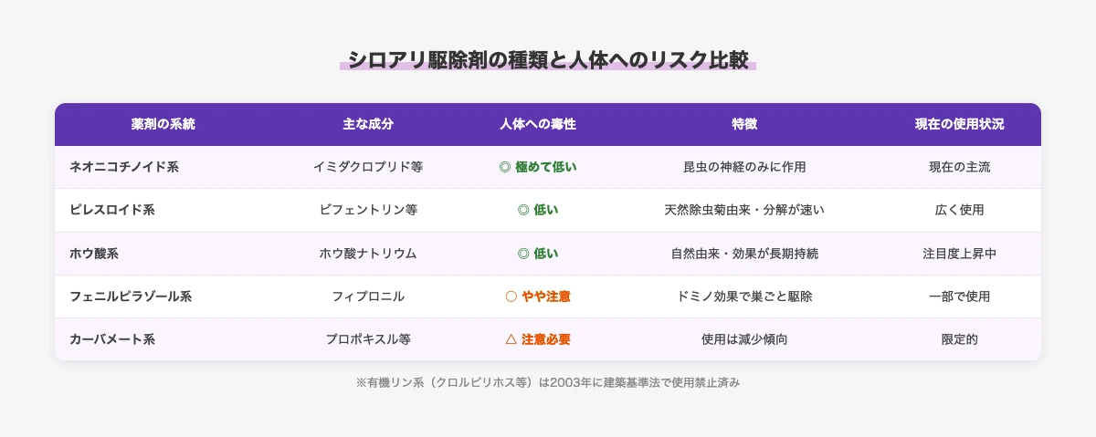 シロアリ駆除剤にはいくつかの系統があり、それぞれ成分・毒性・特徴が異なります。