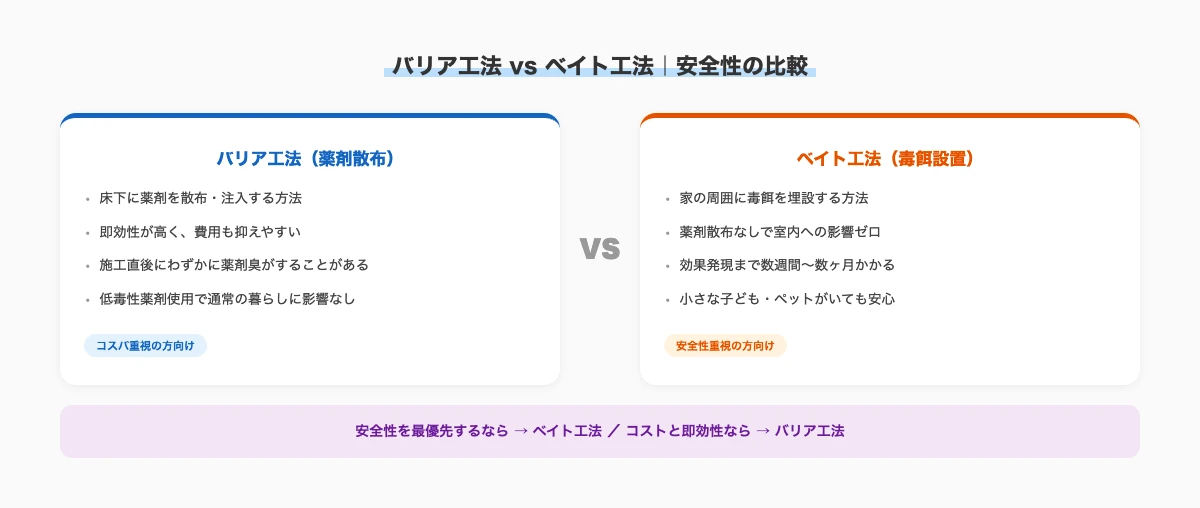 工法による安全性の違い|バリア工法とベイト工法を比較